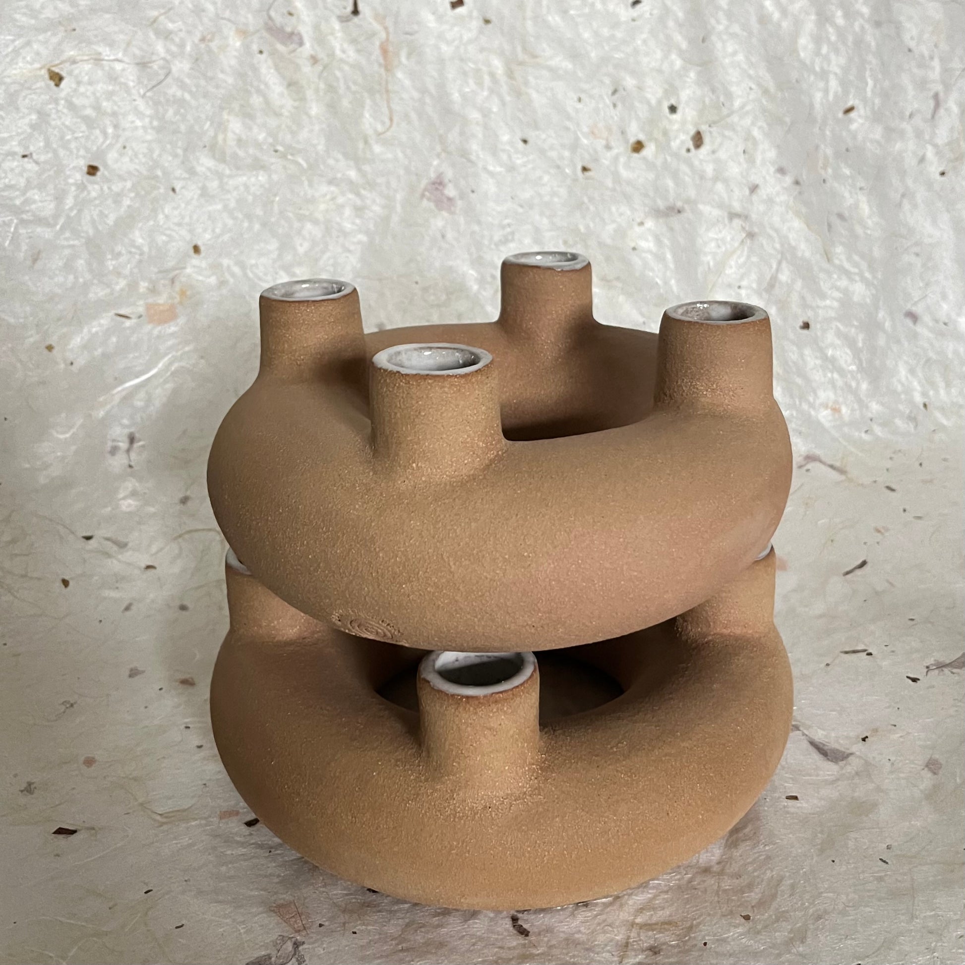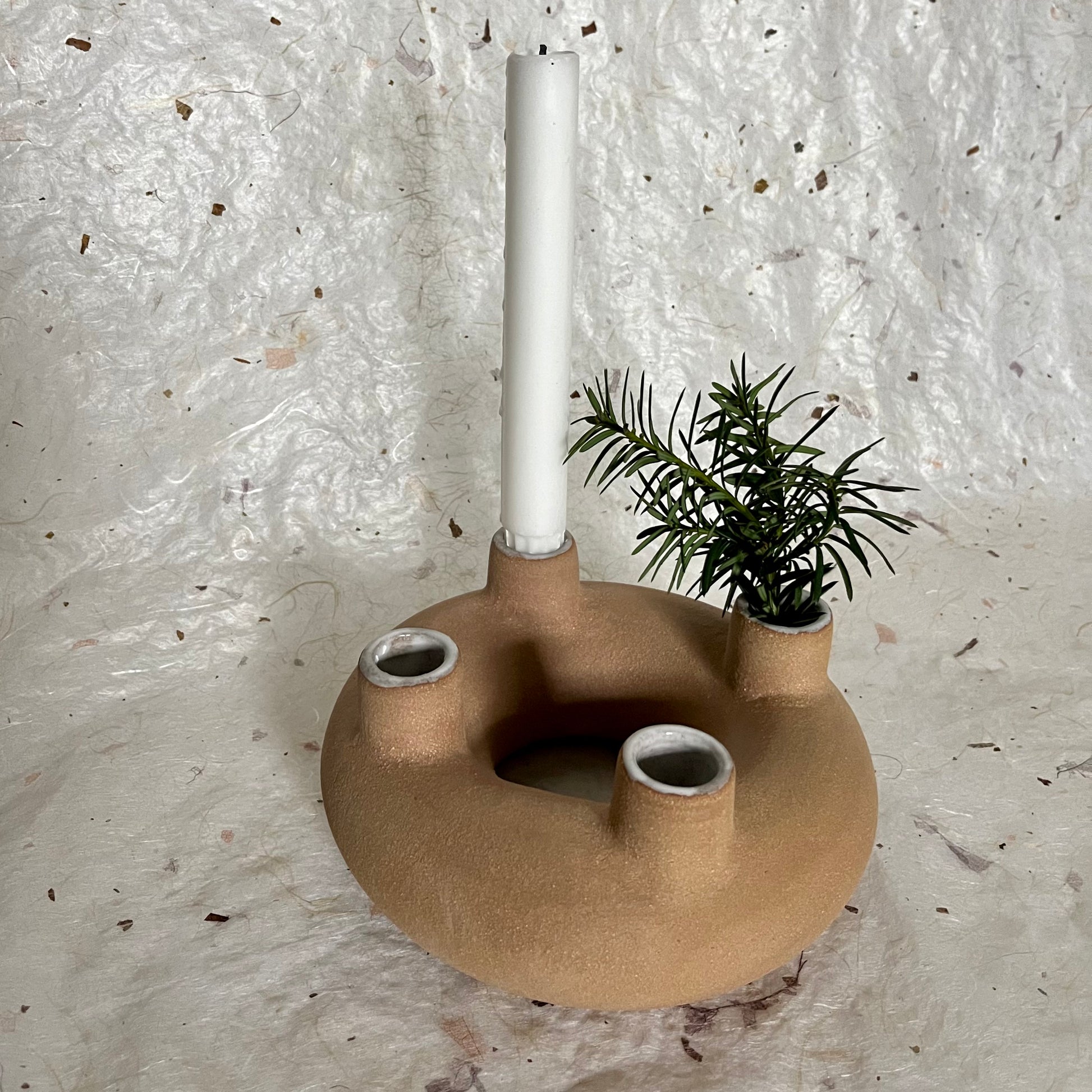 Hygge Rustikk lysestake med glasert innside så den holder vann og kan fungere som vase.